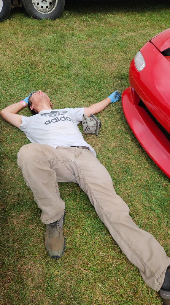 Woke up and went to get some gas, GPS took me to a station without 93 while narrowly avoiding 2 stations that did Eventually got what I needed and headed back to the track. Drivers meeting at 9:00 and then driving started for us at 10:45, not even the full first session and my car is running wacky. I’ve been battling a low idle after driving for a little bit for some time now but always thought it was due to the car heat soaking and not having a proper tune. My car ends up stalling in grid and I cannot get it started only clicks from the starter. Thankfully the awesome lock city staff and patrons helped me push it off to the side and let me borrow a jump pack to get back to my pit area. From the reading on the jump pack I could tell that my alternator isn’t charging the battery anymore(bummer). Luckily our friend Gwyn came down earlier that day to watch us and hang out and she offered to bring me to an O’Reillys to get a new alternator. An hour drive and 25 minute swap out and I was back and ready to turn some laps!