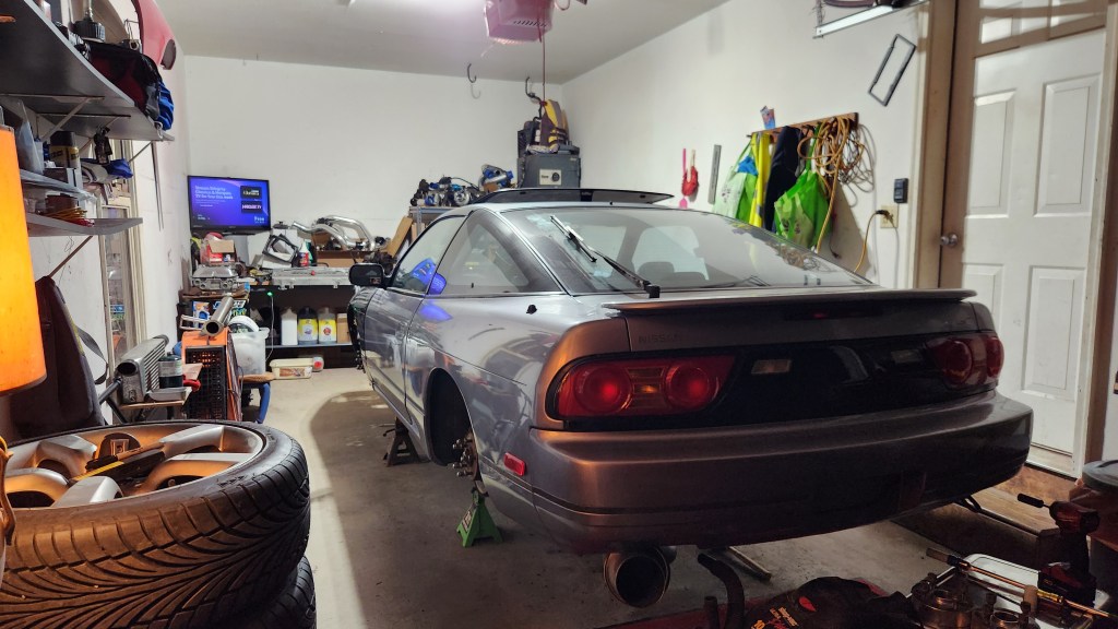 The white wheels are a big change from my gram lights but I love it. Also small 240 update, got the motor mounts fully bolted in and passenger one is in the sub frame. Now awaiting the Enjuku order still so I can make some more progress.