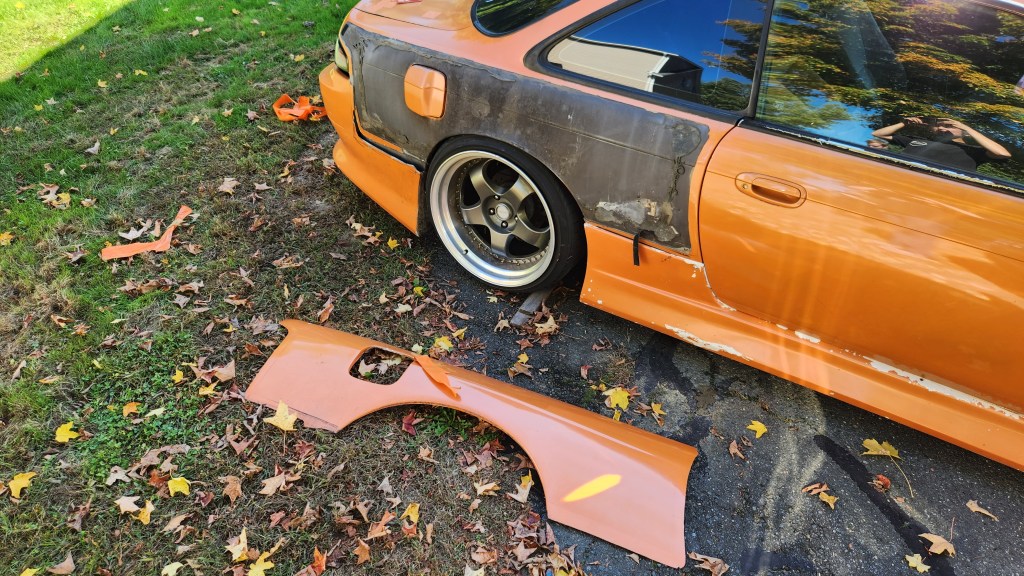 We ended up removing the overfenders off of TJ’s car as they were pretty much off anyways only being help on by tape. His car was a show car from what we have been told by the previous owner and what was told to him. Someone molded the overfenders and rear bumper on probably about 15 years ago and they were both showing their age.